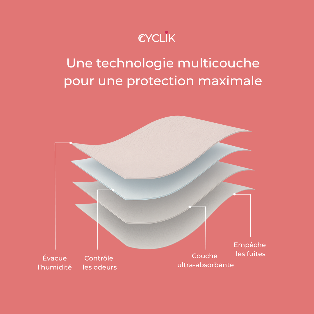 Lavable en machine, Cyclik remplace des dizaines de protections jetables. Une solution saine, écologique et économique, pensée pour ton corps et pour la planète.